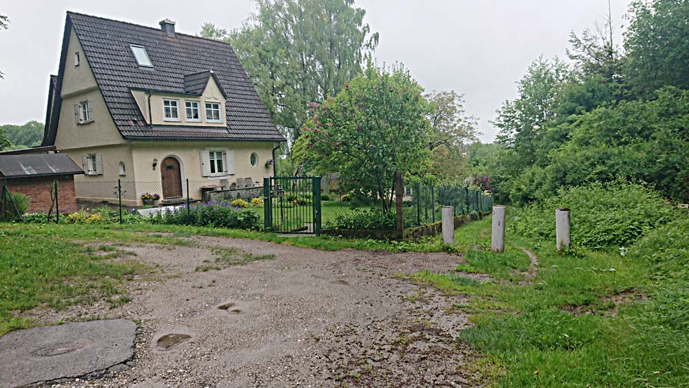 Der alte Straßenverlauf geht heute durch den Trimm-Dich-Pfad-Parkplatz und führt dann als Fußweg (abgetrennt durch drei massive Stempen) weiter Richtung Bruck: