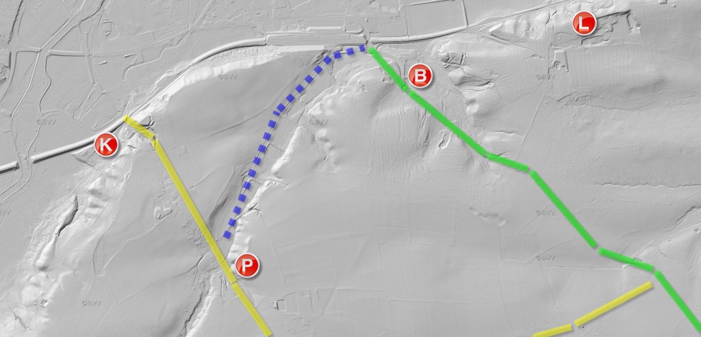 Rein vom Relief würde man die Straße dann sogar noch etwas weiter östlich in die Senke legen, die eigenartigerweise Ludwigshöhe heißt. Aber dort war es vermutlich immer zu sumpfig für eine Straße. Der neue Schlenker von ~1900 bleibt aber gerade noch auf dem Hang oben. Aber womöglich wäre es vor 1900 technisch zu aufwändig gewesen die Straße am Hang zu befestigen.